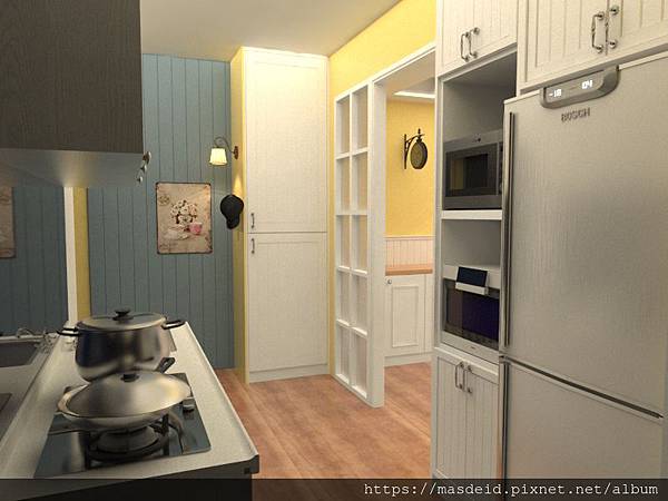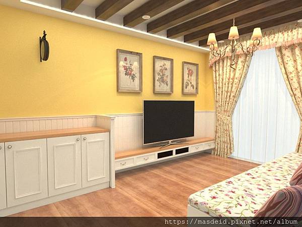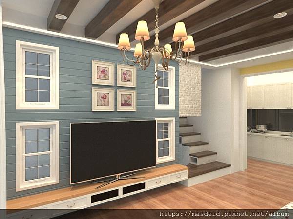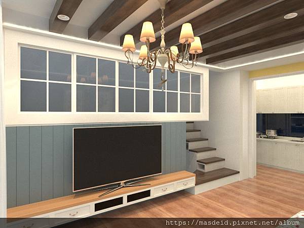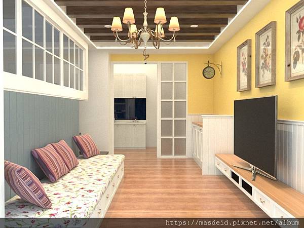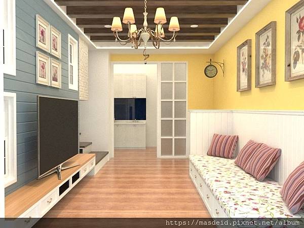 將空間分割規劃為客廳挑高區及電視牆後方夾層睡臥區, 客廳天花以木樑造型分佈全區凸顯挑高氣勢,主色調鵝黃主牆及對比色組合灰藍夾層隔間牆, 搭配上白色線板及窗型板, 營造美式鄉村風格,而小碎花的窗飾及軟件搭配, 也是美式鄉村風不可缺少的要素.