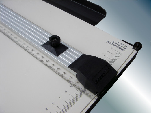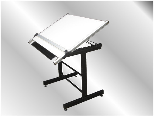 具有傾斜度,桌子前後高低差約1220cm,桌面深約6075cm,市售的製圖桌面,表面均貼上美耐板,有米白、淺綠等色系,桌面分為有磁性、無磁性。基本上,製圖板的厚度要夠,才不會產生桌面不平的情形。