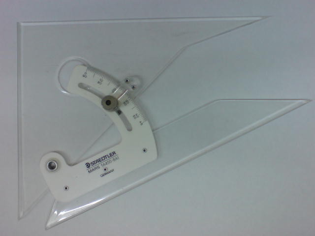 由兩片壓克力組成,可調出不同的角度,有4590的量角數字,可利用板面上的鬆緊螺絲來調出想要繪製角度的線段。