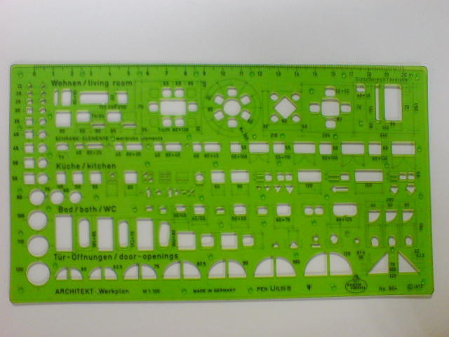 比例上有1:50及1:100,通常大多利用1:50的傢俱板來輔助繪製平面配置圖,空間面積太大時則取用1:100繪製。傢俱板上有室內基本配備、傢俱及衛浴等平、立面的圖學符號、圖案刻孔,而圖案會因廠牌不同而有相異,但都不影響平面圖的繪製。